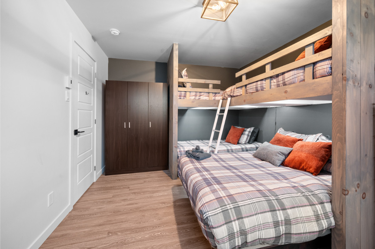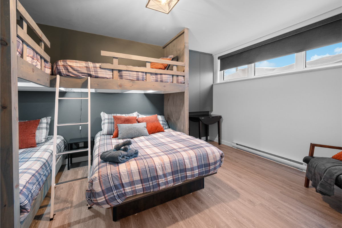 Le chalet peut accueillir jusqu’à 10 personnes et propose un aménagement confortable et fonctionnel, parfait pour les familles ou les groupes d’amis. Il comprend trois chambres bien réparties, offrant deux lits Queen, un lit double, une superposition de trois lits simples et un lit simple (total : 10 places), deux salons répartis sur deux niveaux ainsi que deux salles de bain complètes, dont une avec douche pluie à l’étage. Les espaces communs sont lumineux et conviviaux, idéaux pour se retrouver après une journée d’activités.