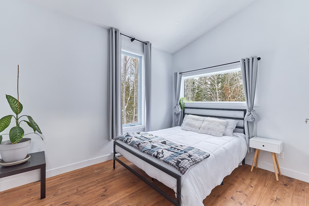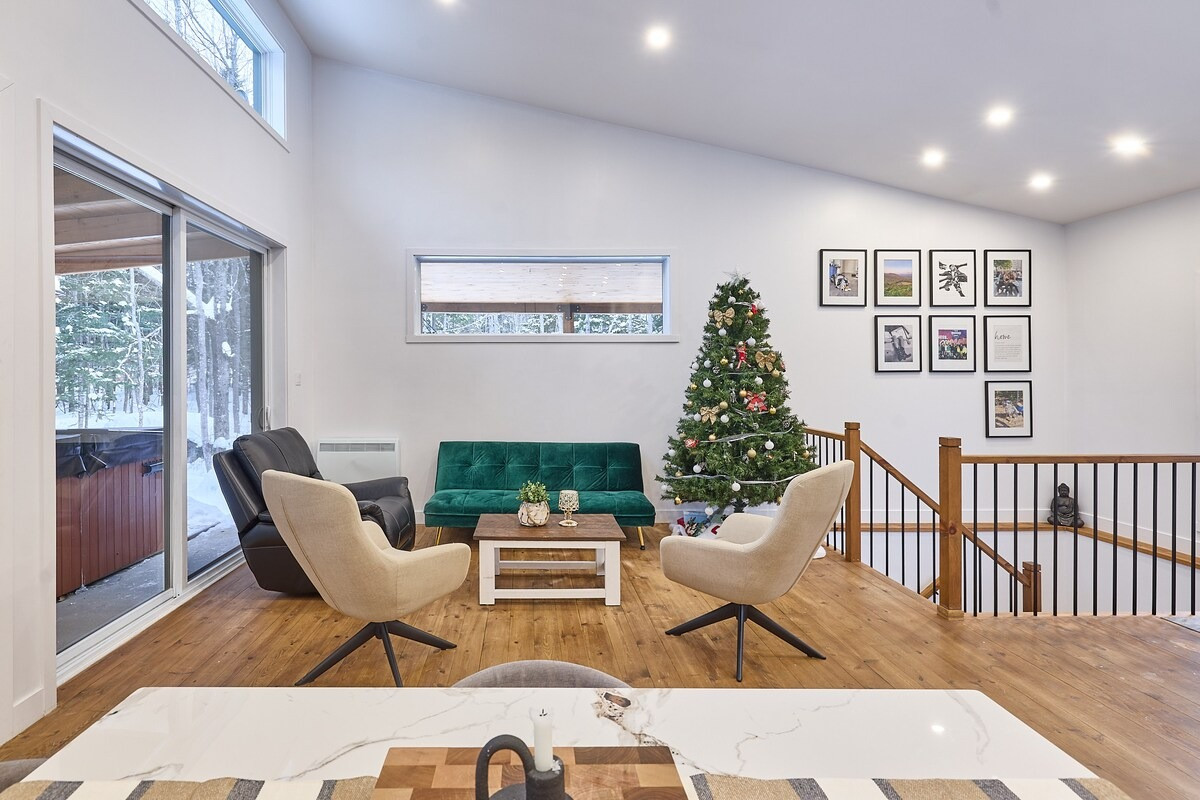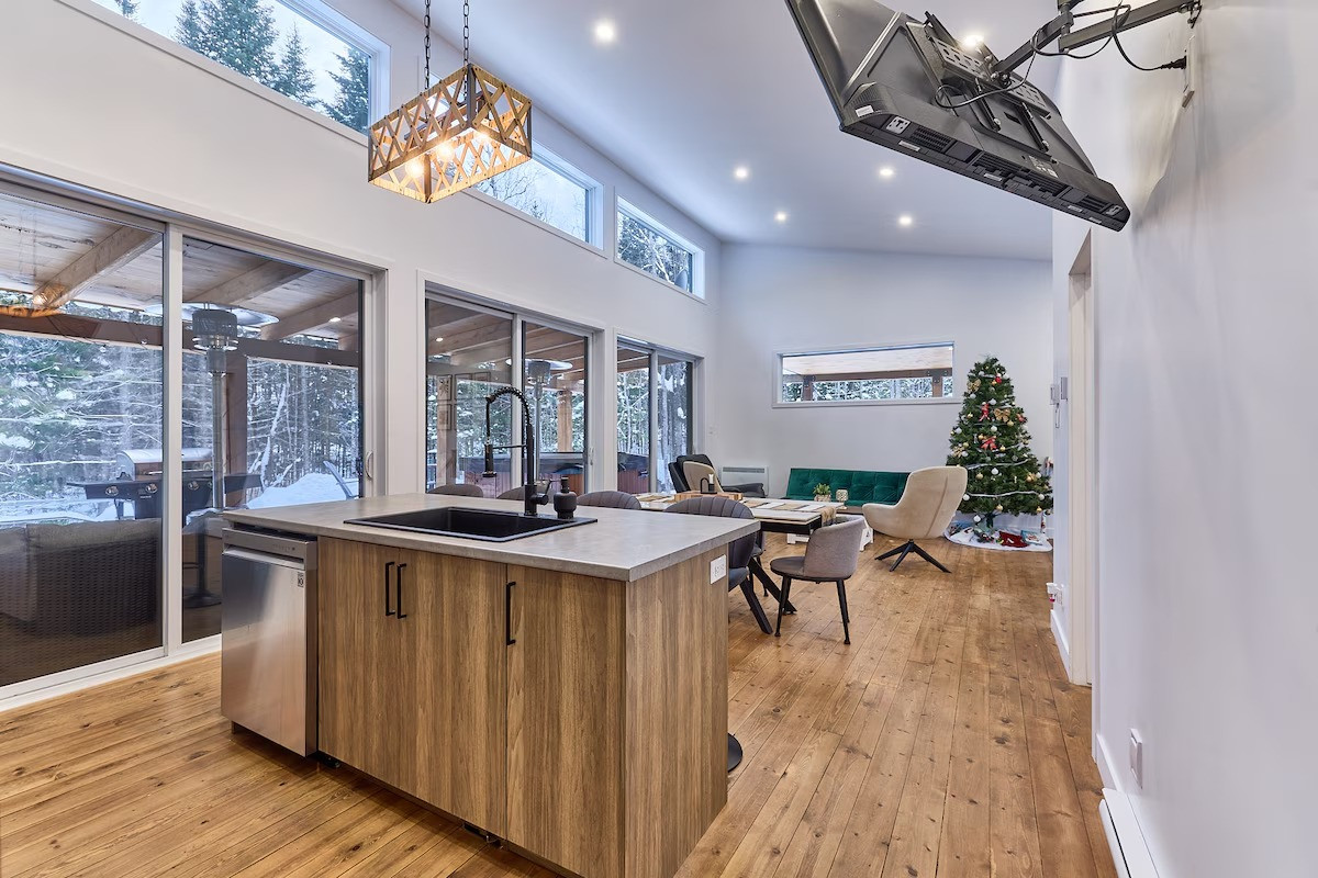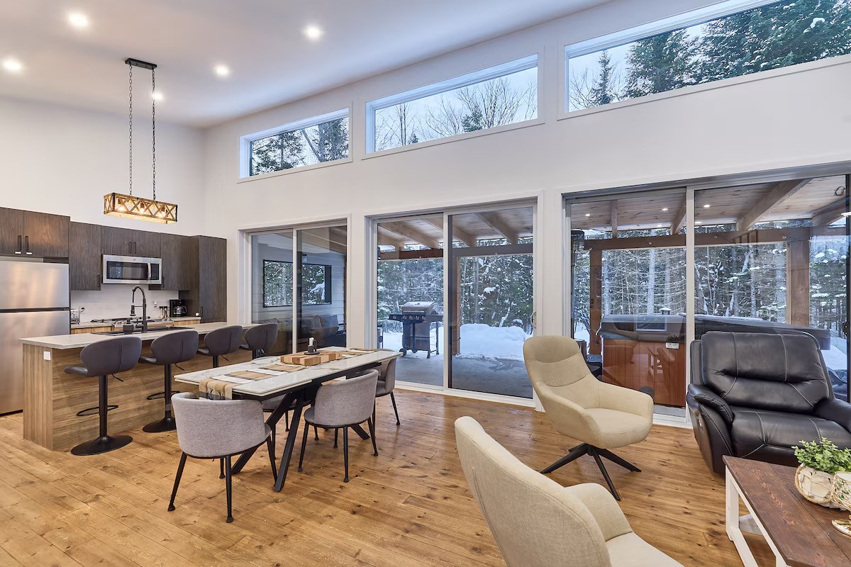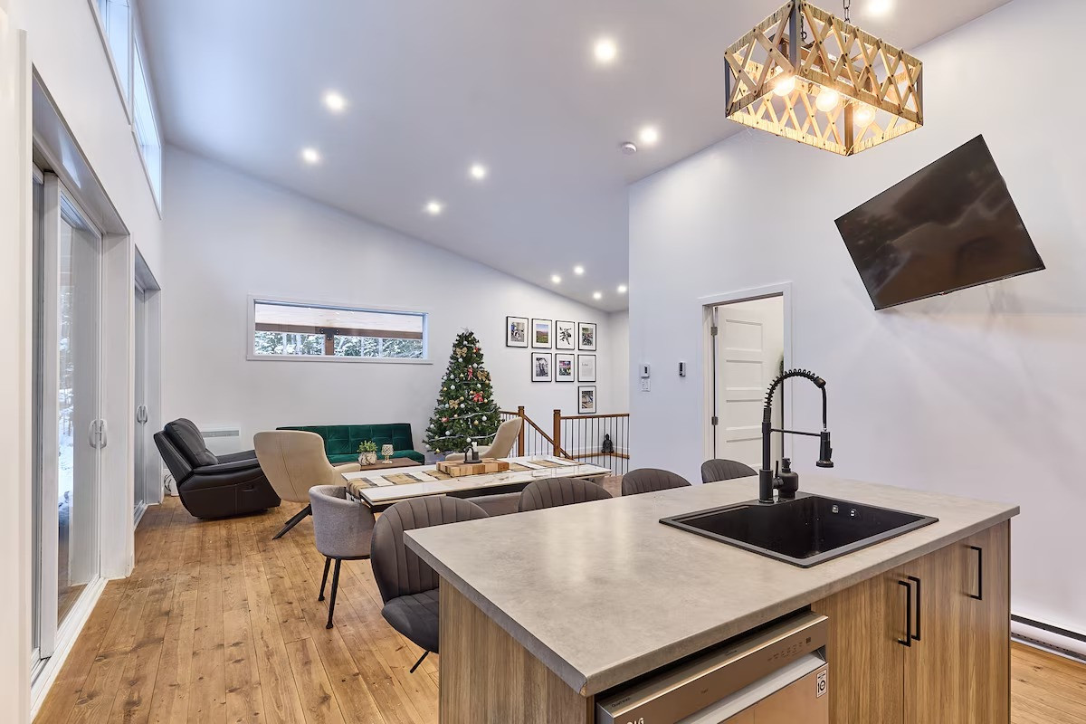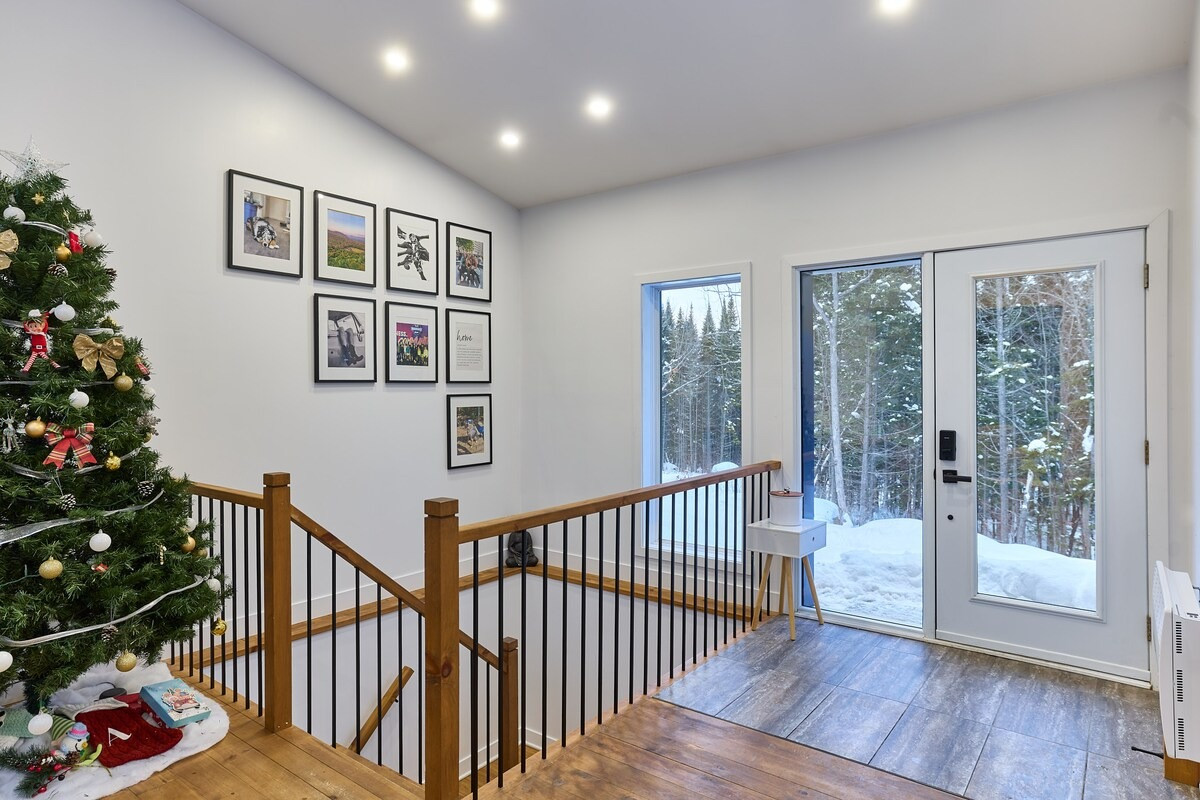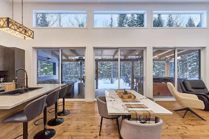 Pensé pour accueillir jusqu’à 10 personnes, le chalet propose des espaces chaleureux et lumineux grâce à une grande fenestration offrant une vue directe sur la nature. Vous y trouverez 3 chambres confortables (2 lits queen, 2 lits doubles) ainsi que plusieurs options de couchage supplémentaires, idéales pour les groupes et les familles. La cuisine entièrement équipée vous permet de cuisiner comme à la maison, tandis que le salon devient l’endroit parfait pour relaxer après une journée bien remplie. En plus des incontournables comme le Wi-Fi et une télé intelligente, vous aurez accès à des jeux de société, une table de billard et une table de ping-pong. Un tapis roulant est également à votre disposition pour rester actif durant votre séjour.