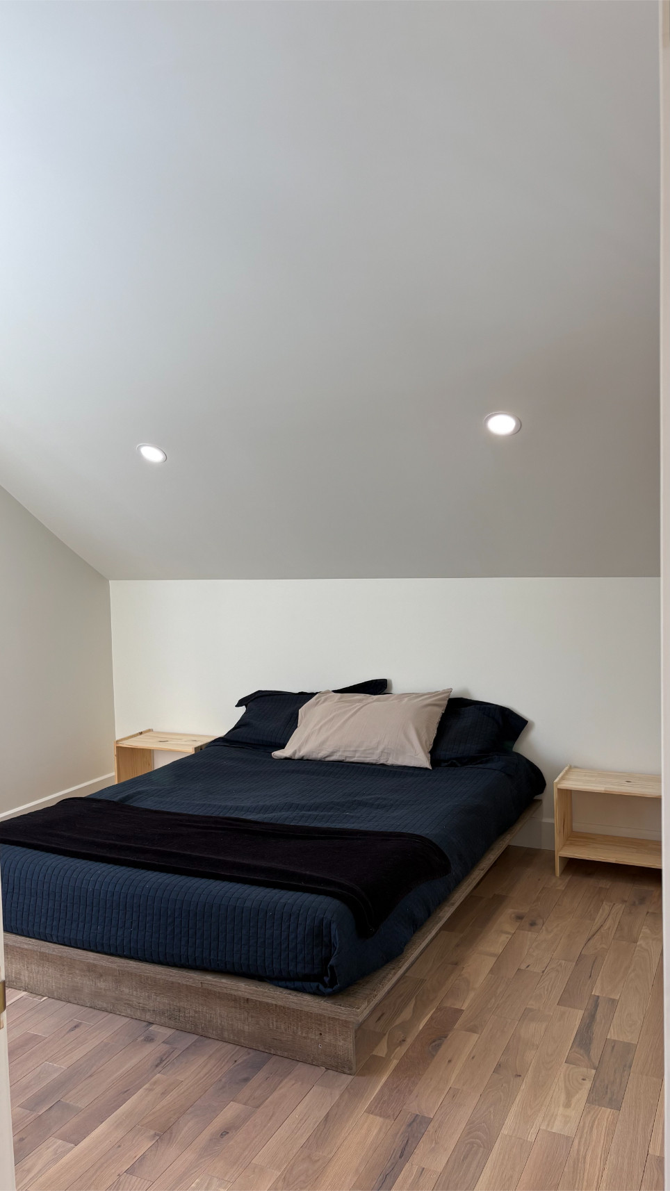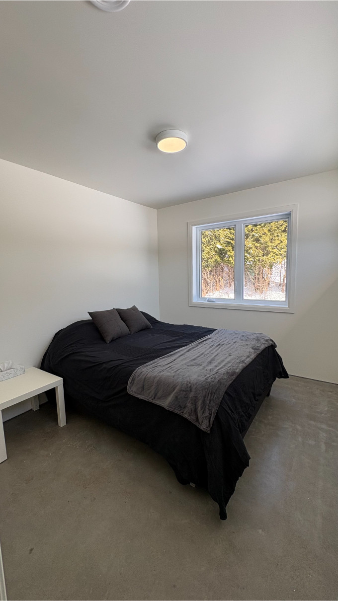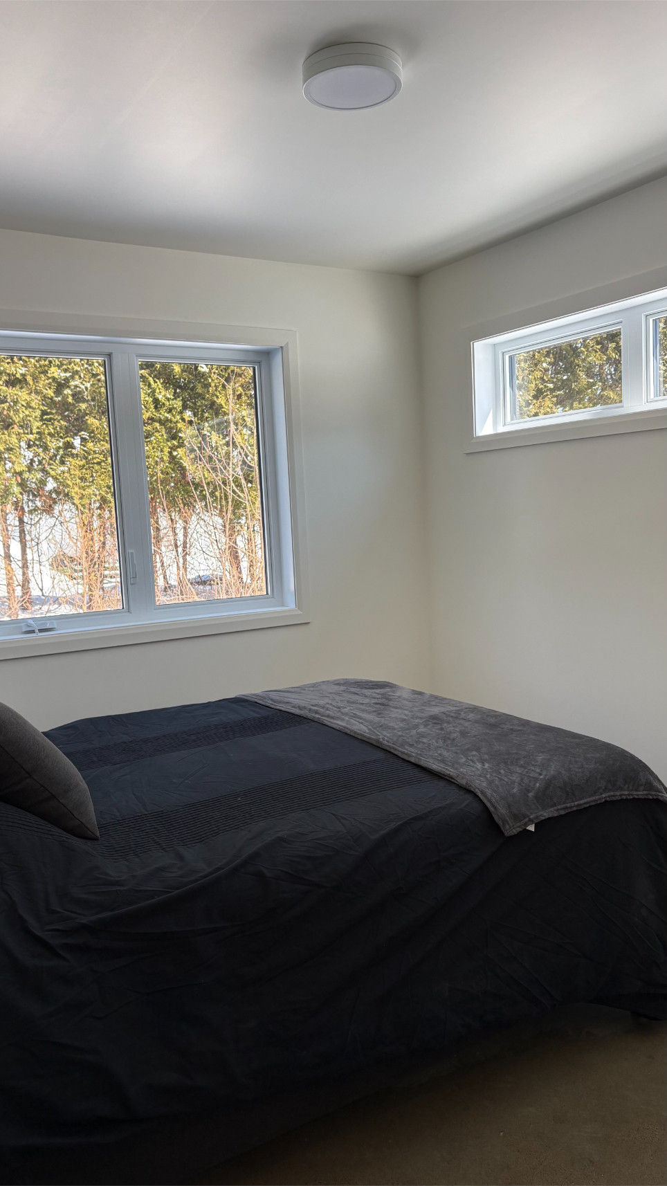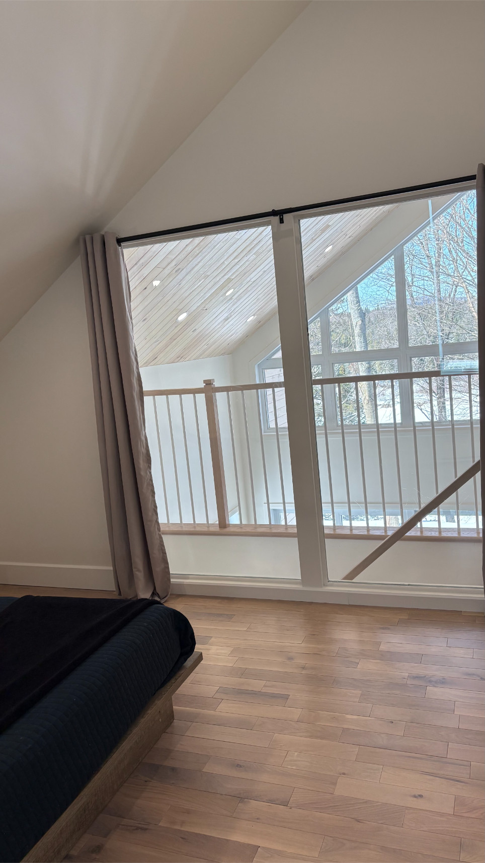 The chalet can accommodate up to 6 guests and features 2 closed bedrooms with queen beds, plus a mezzanine with a double bed (open space). The cathedral ceiling and large windows provide abundant natural light and a relaxing atmosphere surrounded by nature.