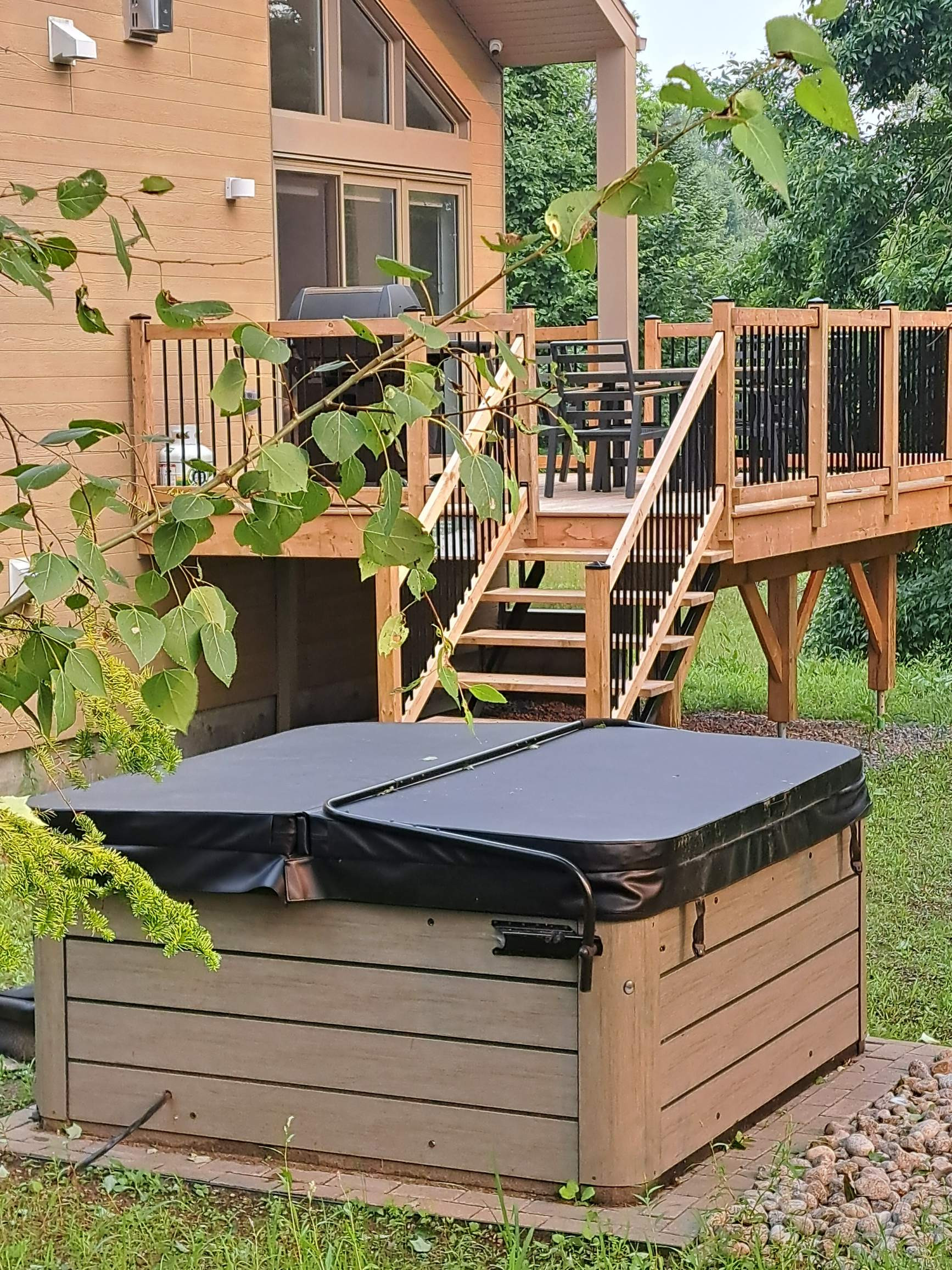 This villa boasts a private spa available year-round, ideal for relaxing in any season. An indoor propane fireplace adds a cozy ambiance, while a ping-pong table and board games provide entertainment. A BBQ is also available from May to October, perfect for seasonal grilling.